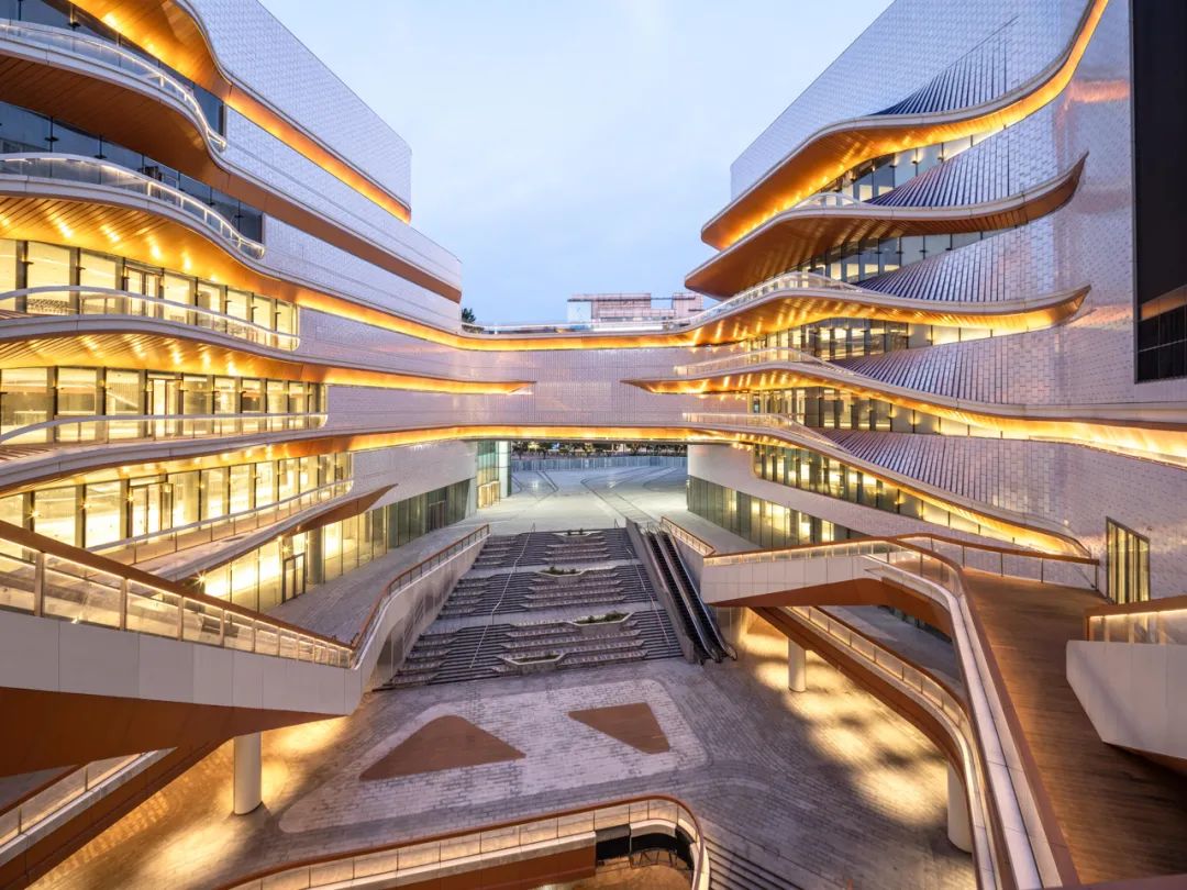 串聯(lián)空間內(nèi)外的環(huán)游動線和半室外多層次的空中回廊,環(huán)環(huán)相扣,相當于潺潺的溪流,在引導人流的同時,讓空間的層次感和趣味性變得更強了。且商場與下沉式廣場、戶外平臺、屋頂花園乃至辦公樓都有很便捷的通道。