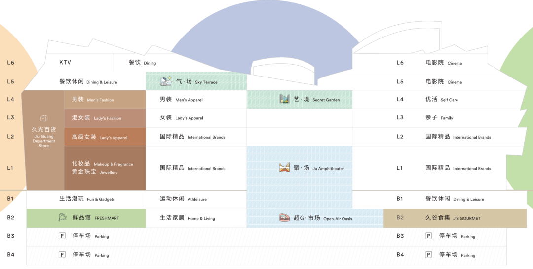 商業(yè)樓層共8層,地下2層加地上6層。主力店位于中庭和環(huán)廊的主干道旁,顧客在換乘扶梯和電梯時,可把這些品牌的門面盡收眼底。具體每個樓層的業(yè)態(tài)區(qū)隔可參考下圖——