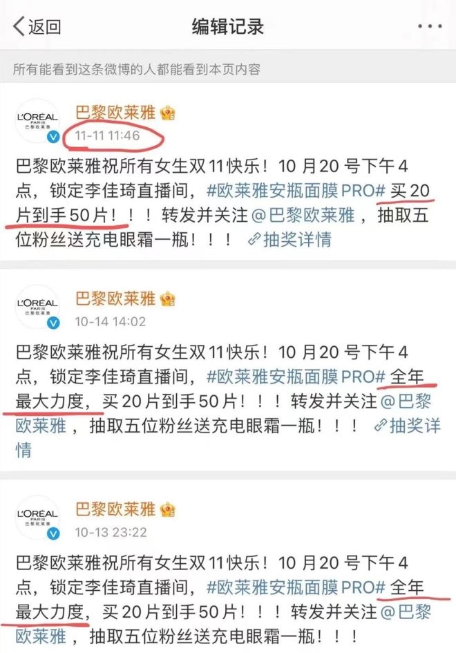 北京商報(bào)記者在李佳琦直播間回放中看到,并未有歐萊雅安瓶面膜為最低價(jià)的相關(guān)言論。但在巴黎歐萊雅的微博編輯記錄中,對(duì)于李佳琦10月20日直播中銷售的安瓶面膜官方稱是“全年最大力度”,但該表述現(xiàn)已被巴黎歐萊雅官方微博刪除。