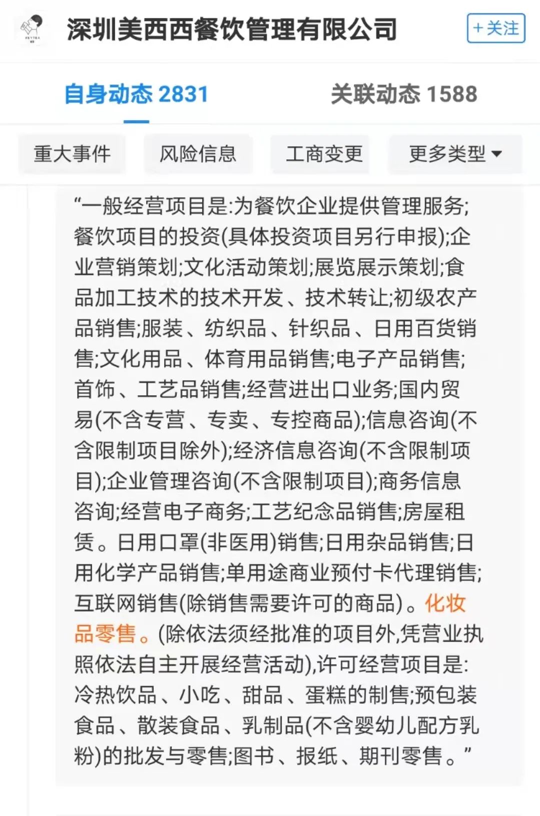 企查查顯示,喜茶關(guān)聯(lián)公司深圳美西西餐飲管理有限公司于近日發(fā)生工商變更,公司經(jīng)營范圍新增化妝品零售。