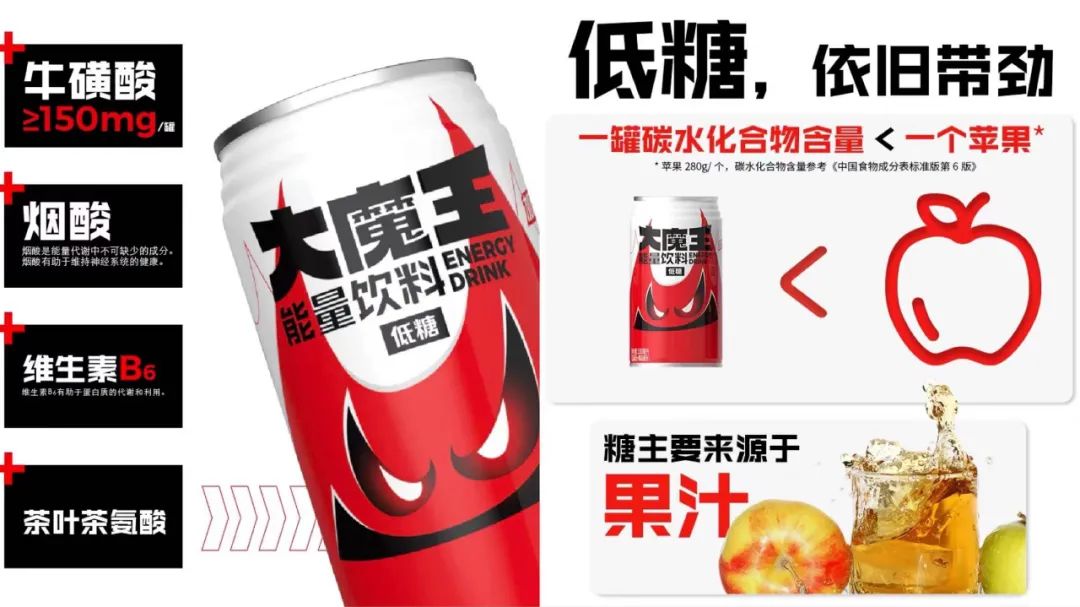 目前,“大魔王”已上線天貓外星人旗艦店,330ml,12瓶,售價70.2元。據(jù)其資料顯示,“大魔王”采用金屬罐裝包裝形式,有低糖和經(jīng)典兩個版本,其中低糖版本糖分主要來源于濃縮蘋果汁。產(chǎn)品添加牛磺酸、煙酸、維生素B6、茶葉茶氨酸等成分,不添加防腐劑與色素。而無論從外包裝、配料成分還是其6.5元的單價策略都不難看出,“大魔王”將對標(biāo)品直指紅牛。