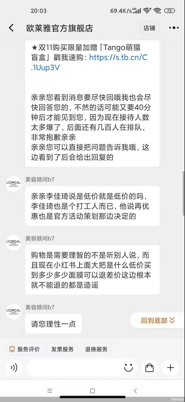 對(duì)于消費(fèi)者的投訴,巴黎歐萊雅回應(yīng)稱(chēng):“經(jīng)了解,此次出現(xiàn)部分消費(fèi)者以低于直播間到手價(jià)拍下商品,是因?yàn)榀B加使用了多種平臺(tái)和店鋪的優(yōu)惠,享受這些優(yōu)惠是需要湊單達(dá)到一定總價(jià)格門(mén)檻的,同時(shí)平臺(tái)系統(tǒng)會(huì)自動(dòng)將符合條件的優(yōu)惠平攤到活動(dòng)商品上才能達(dá)到的。在收到消費(fèi)者相關(guān)反饋后,品牌已在第一時(shí)間成立專(zhuān)門(mén)售后服務(wù)小組積極處理消費(fèi)者的相關(guān)問(wèn)詢(xún)!