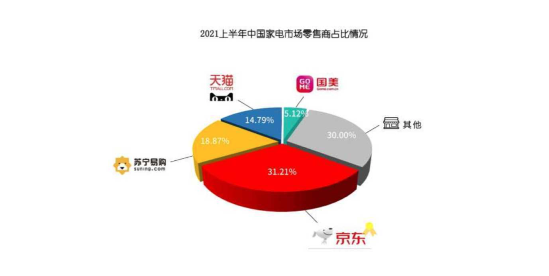 可實際上,國美已經(jīng)跌出主流舞臺許久了!2021年上半年中國家電市場報告》顯示,僅京東、蘇寧易購、天貓三大平臺就占據(jù)中國家電市場近65%的份額。其中,京東占比31.21%,蘇寧易購占比18.87%,天貓占比14.79%,而國美占比僅有5.12%。