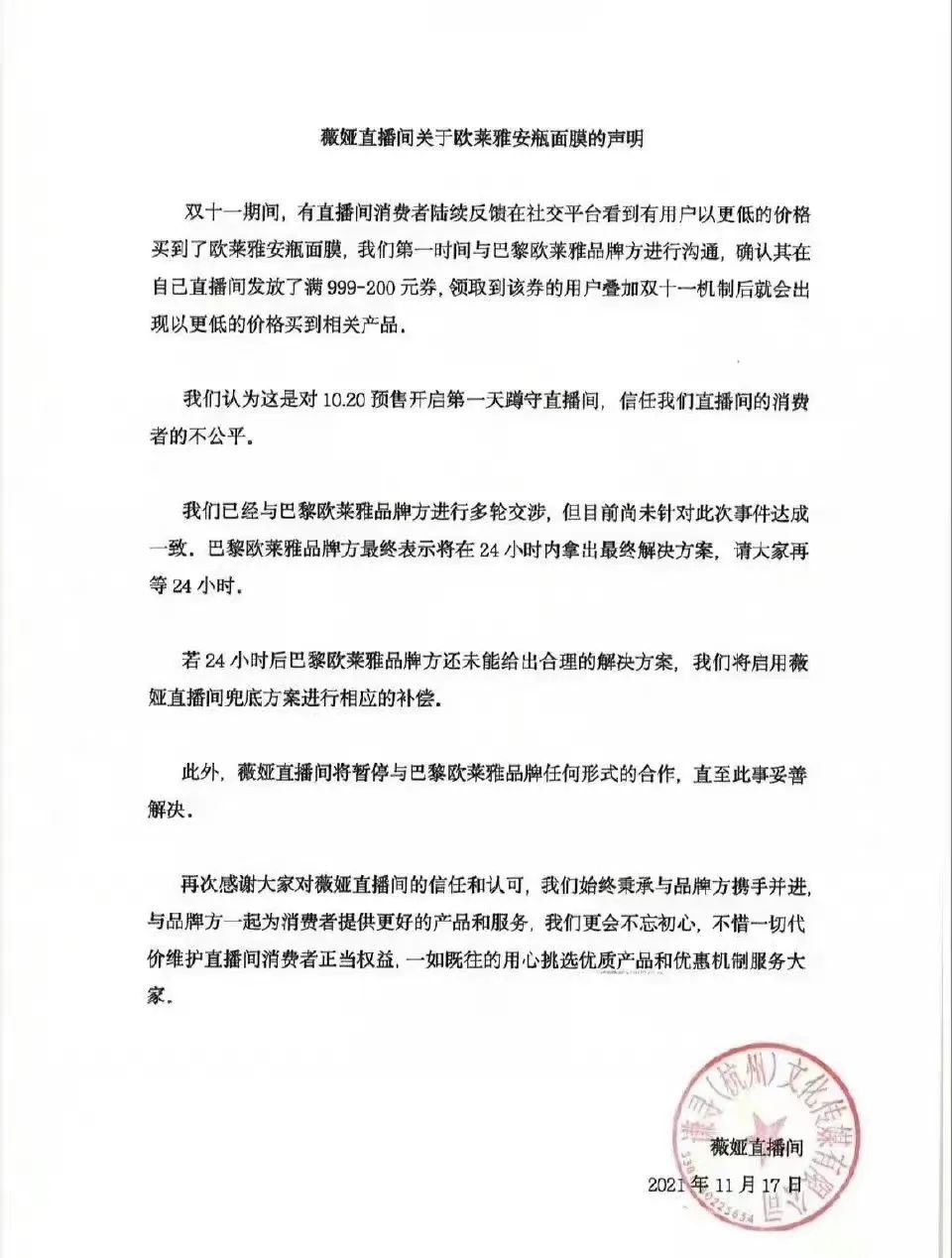 謙尋公司稱:“巴黎歐萊雅品牌方最終表示將在24小時內(nèi)拿出最終解決方案,請大家再等24小時,若24小時后巴黎歐萊雅品牌方還未能給出合理的解決方案,我們將啟用薇婭直播間兜底方案進(jìn)行相應(yīng)的補(bǔ)償。薇婭直播間將暫停與巴黎歐萊雅品牌任何形式的合作,直至此事妥善解決!