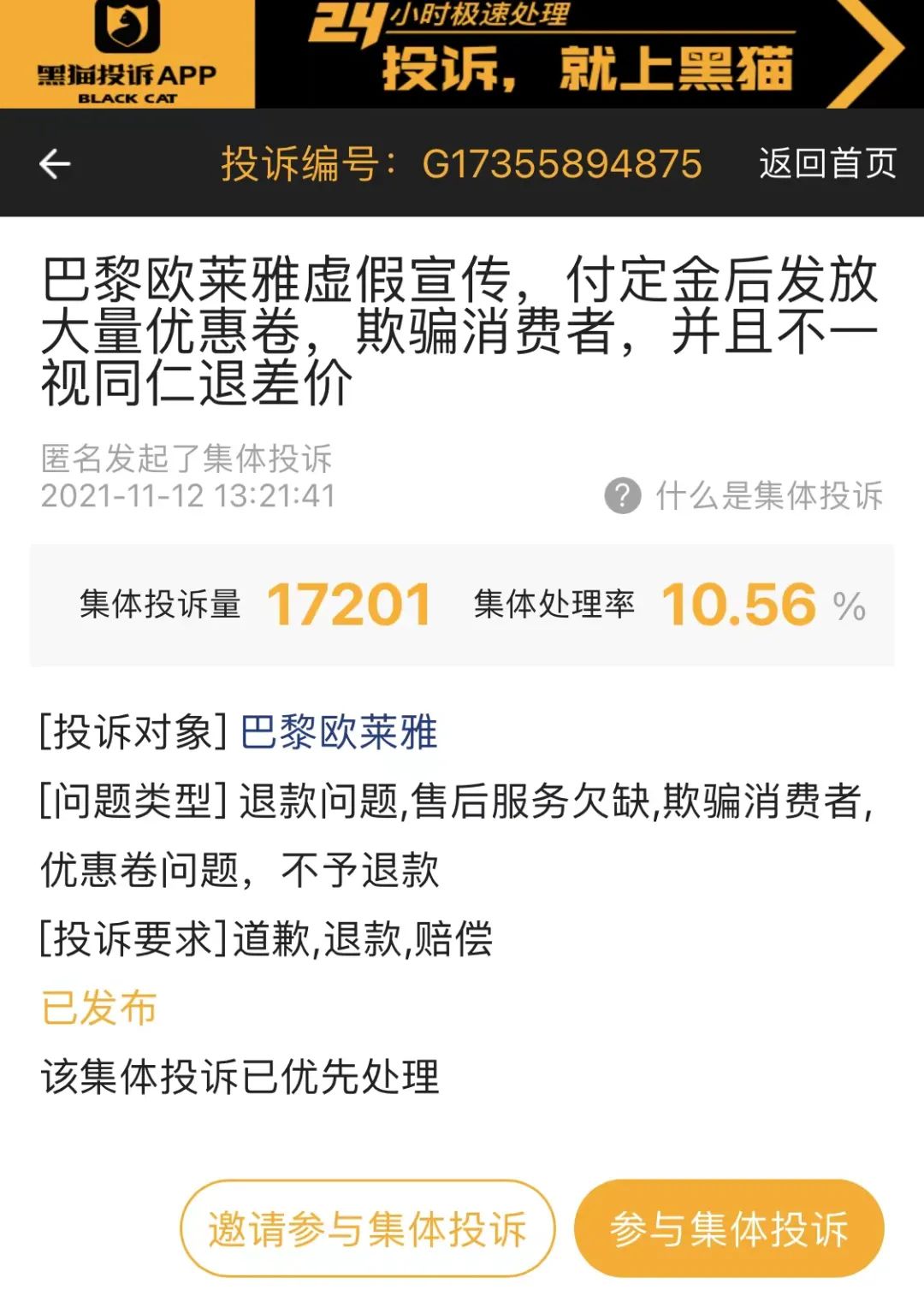 截至11月17日晚,黑貓平臺有關(guān)歐萊雅安瓶面膜退差價、不發(fā)貨的投訴者已上萬。