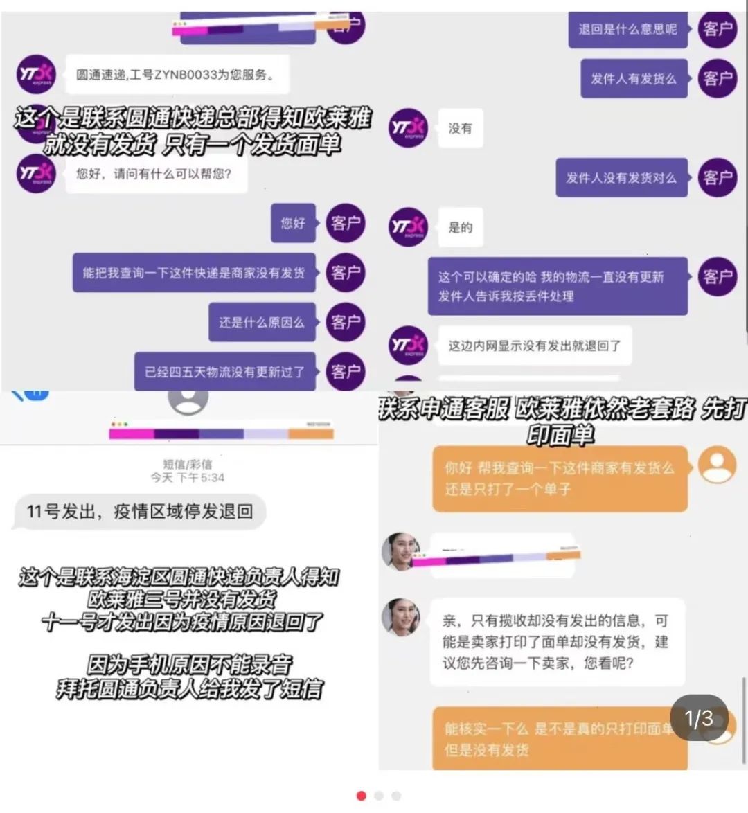 消費(fèi)者通過(guò)咨詢快遞公司,發(fā)現(xiàn)歐萊雅只打印了面單,虛假發(fā)貨。