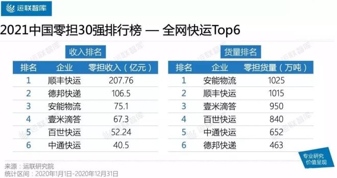 在《2020中國零擔企業(yè)30強排行榜》中,順豐快運2019年零擔收入超過德邦;此外,據2019年財報顯示,順豐快運業(yè)務(順豐快運+順心捷達)實現收入126.59億元,同樣高于德邦股份的107.46億元。