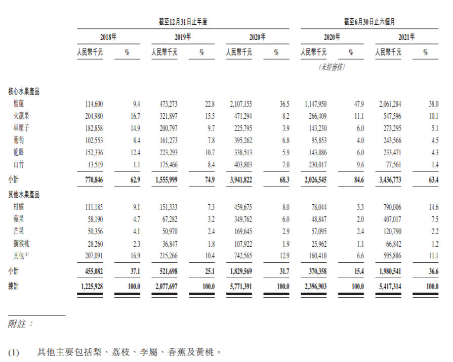 與此同時,榴蓮也成為公司創(chuàng)收的最大來源,同期銷售收入分別為1.15億元、4.73億元與21.07億元,占同期總營收的9.4%、22.8%和36.5%。