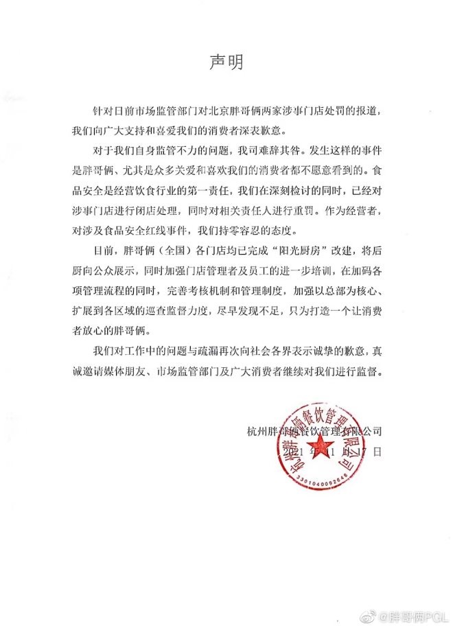 胖哥倆表示,對(duì)公司自身監(jiān)管不力的問(wèn)題難辭其咎,目前涉事門店已進(jìn)行閉店處理,對(duì)相關(guān)責(zé)任人進(jìn)行重罰。