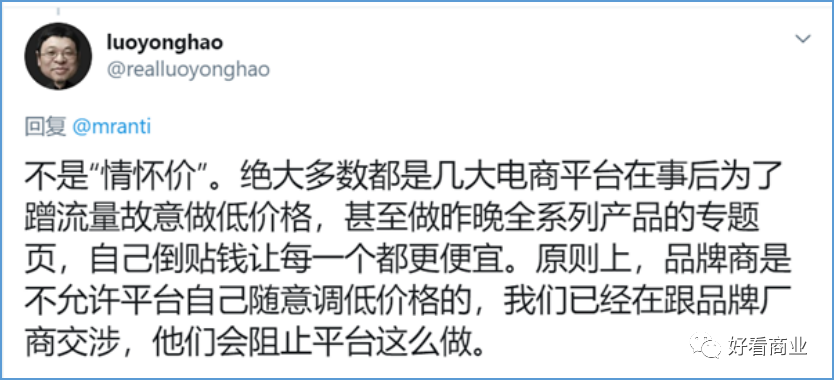羅永浩就此在推特回應(yīng)稱,(這些行為)絕大多數(shù)都是幾大電商平臺事后為了蹭流量故意做低價格,倒貼錢讓每一個都便宜。