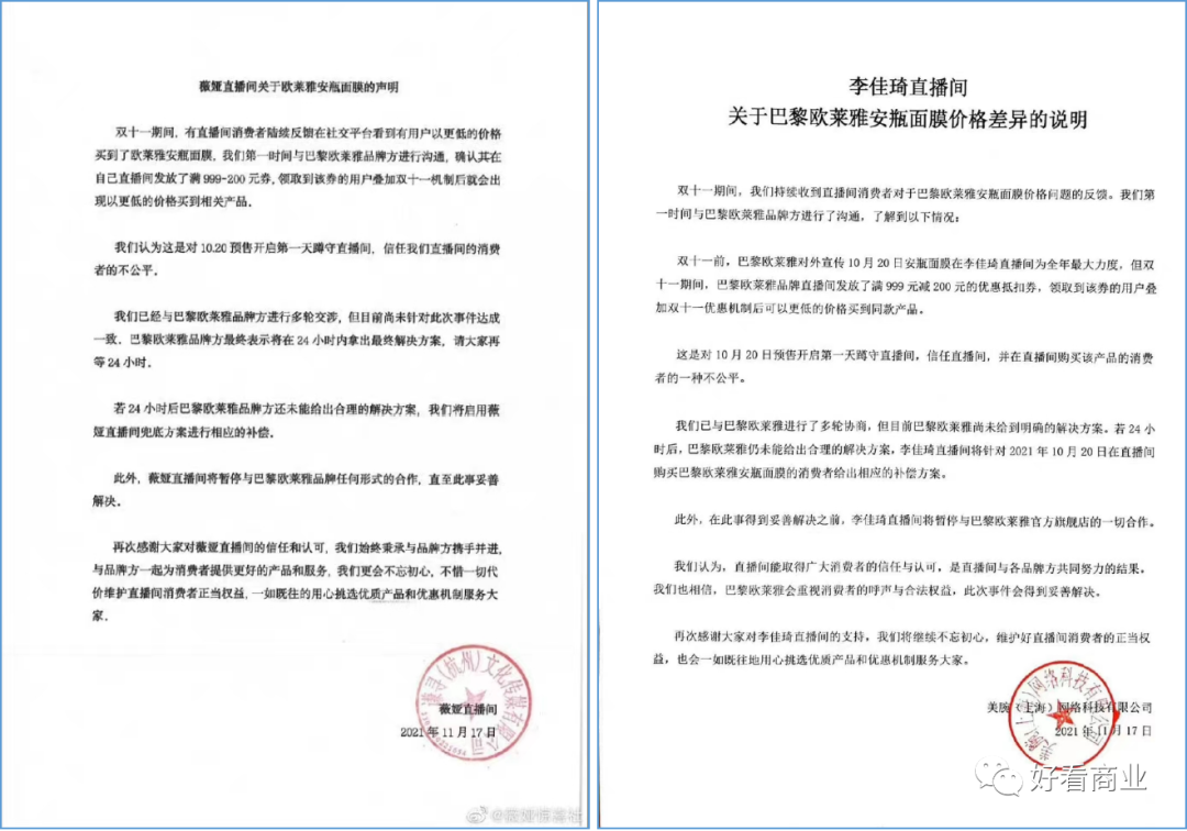 11月17日約20點,李佳琦和薇婭直播間幾乎同時發(fā)布聲明,雙方均稱,若巴黎歐萊雅方面24小時后仍未能給出合理的解決方案,雙方直播間都將啟用兜底方案,對消費者進行賠償。