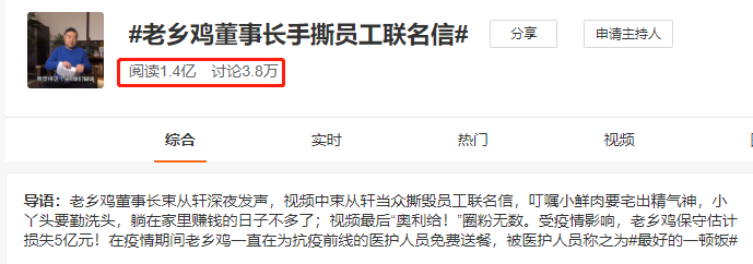 2020年疫情期間,束從軒手撕員工聯(lián)名信的視頻火爆全網(wǎng),“哪怕是賣房子、賣車子,也要確保你們有飯吃,有班上,”、“而且像這種躺著把錢賺的日子也不多了,疫情結(jié)束后有你們忙活的日子!睉{借此視頻,讓束從軒以及背后的老鄉(xiāng)雞公司在網(wǎng)絡(luò)上迅速打開了知名度。