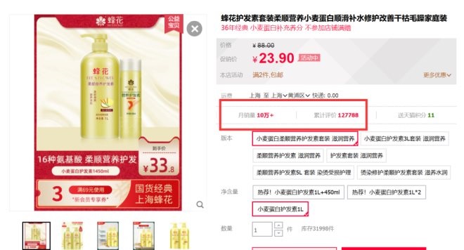 時代周報記者在天貓蜂花居家日用旗艦店看到,單瓶標價23.9元的蜂花護發(fā)素一升裝,月銷量已達10萬+,累計評價超12萬條;單瓶標價11.9元的450毫升裝,月銷量達1萬+,蜂花生姜洗發(fā)露,750毫升裝單瓶標價44.9元,月銷量也已達2萬+。