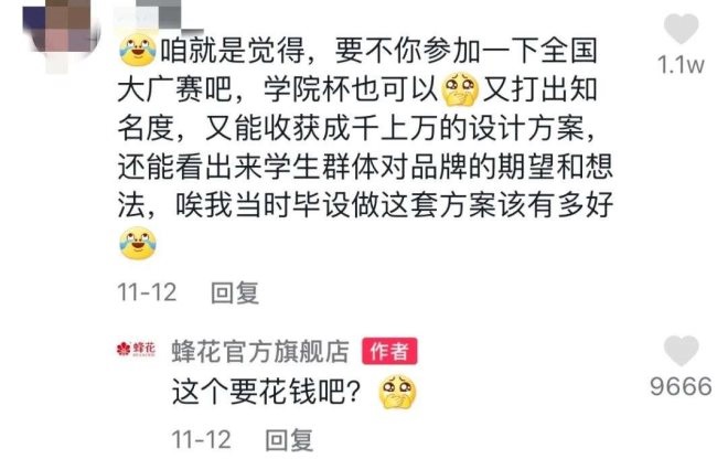 其中有網(wǎng)友提議,讓蜂花參加大學(xué)生廣告設(shè)計(jì)大賽,而品牌回復(fù)讓人哭笑不得。