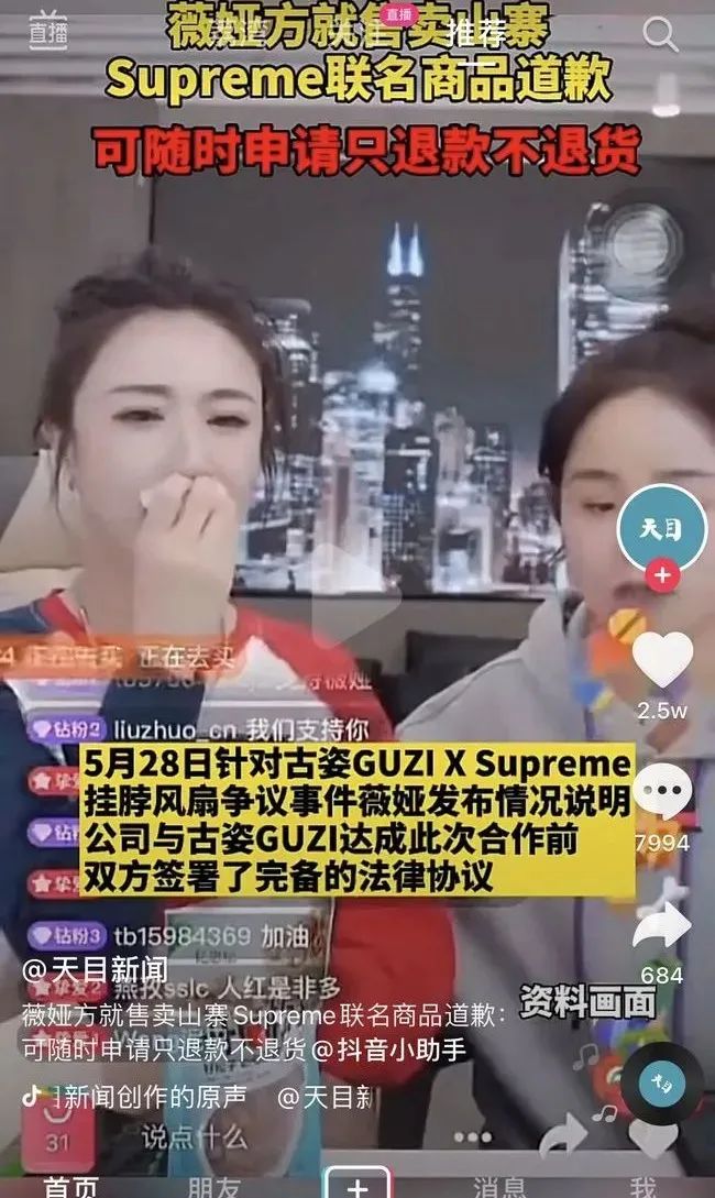 2021年薇婭依舊翻車不少。今年5月,薇婭在直播間反復(fù)強(qiáng)調(diào)是“正版GUZI與Supreme聯(lián)名風(fēng)扇”的掛脖風(fēng)扇被質(zhì)疑“山寨貨、中看不中用”,引發(fā)諸多討伐,最終不得不以官微發(fā)布“致歉聲明”收?qǐng)觥?/p>