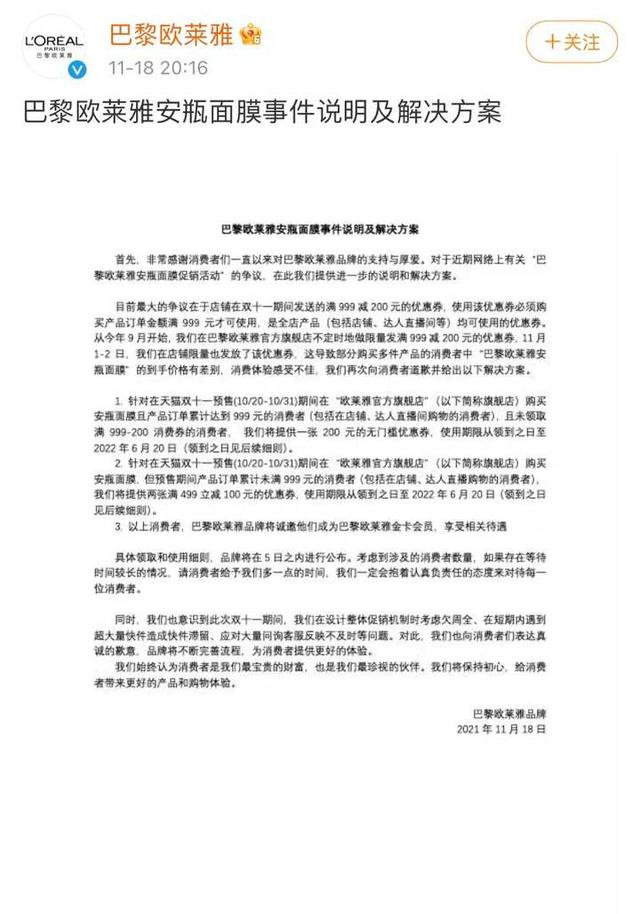 就在剛才,巴黎歐萊雅通過官方微博發(fā)文稱,對于近期網(wǎng)絡(luò)上有關(guān)“巴黎歐萊雅安瓶面膜促銷活動”的爭議,在此我們提供進(jìn)一步的說明和解決方案。應(yīng)該來說,巴黎歐萊雅的處事態(tài)度是值得認(rèn)可的。畢竟,品牌的最終買單方是消費(fèi)者,巴黎歐萊雅適時(shí)給消費(fèi)者一個(gè)合理的交代是有必要的。