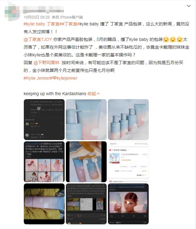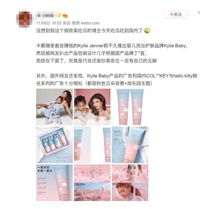 此外,近期,微博上還有網(wǎng)友發(fā)文稱,卡戴珊家族中Kylie Jenner(凱莉·詹娜)推出的嬰兒洗浴護(hù)膚品牌Kylie Baby(凱莉?qū)氊悾┑漠a(chǎn)品包裝,與國(guó)產(chǎn)品牌丁家宜旗下的粉紅蘆薈修護(hù)凝膠的外觀有所類似。不過,目前丁家宜暫未就此發(fā)布公開聲明。根據(jù)國(guó)家藥監(jiān)局備案信息顯示,丁家宜粉紅蘆薈修護(hù)凝膠在今年2月23日取得的產(chǎn)品備案;而公開報(bào)道顯示,Kylie Baby于今年9月份推出。