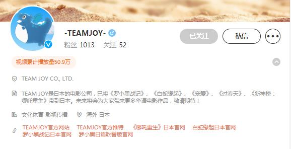 “—TEAM JOY—”賬號(hào)主體則為TEAM JOY CO.,LTD.,該微博的認(rèn)證介紹顯示,“TEAM JOY是日本的電影公司,已將《羅小黑戰(zhàn)記》、《白蛇緣起》、《新神榜:哪吒重生》等多部影片帶到日本。”