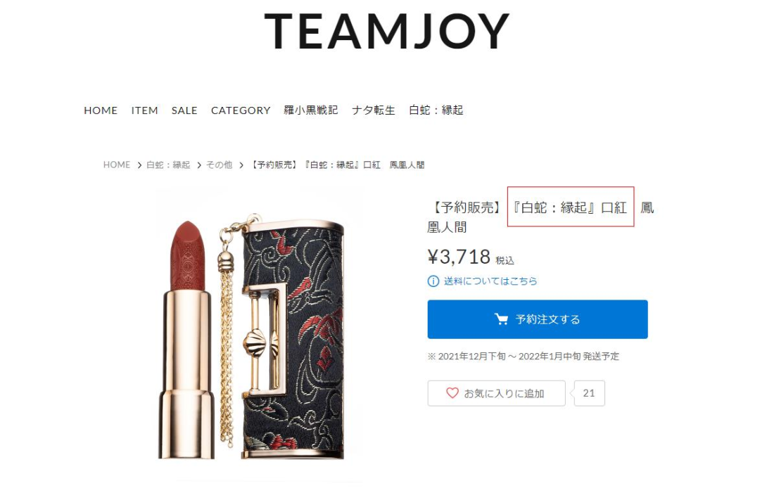 今日上午11時(shí)許,青眼在TEAM JOY網(wǎng)站上看到,上面有2款外觀類似花西子“同心鎖口紅”的口紅正在預(yù)售中,產(chǎn)品名稱即顯示為“白蛇:緣起”口紅,且售價(jià)均為3718日元(約合人民幣208元)。不過,從這2款口紅的外觀和產(chǎn)品介紹,無法判定出自哪個(gè)品牌。除這2款口紅外,TEAM JOY網(wǎng)站上還銷售有多款《白蛇:緣起》IP的周邊產(chǎn)品,包含了手機(jī)扣、小飾品等。