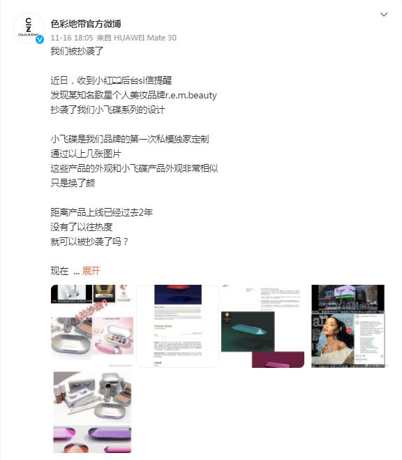 無獨(dú)有偶,就在兩日前的11月16日,國(guó)貨美妝品牌色彩地帶也在官方微博發(fā)文稱,“品牌旗下小飛碟系列產(chǎn)品的外觀設(shè)計(jì)被某知名歌星的美妝品牌r.e.m. beauty 抄襲。”色彩地帶表示,旗下小飛碟產(chǎn)品在2年前就已經(jīng)上線,而且這是品牌第一次獨(dú)家定制的產(chǎn)品包裝。