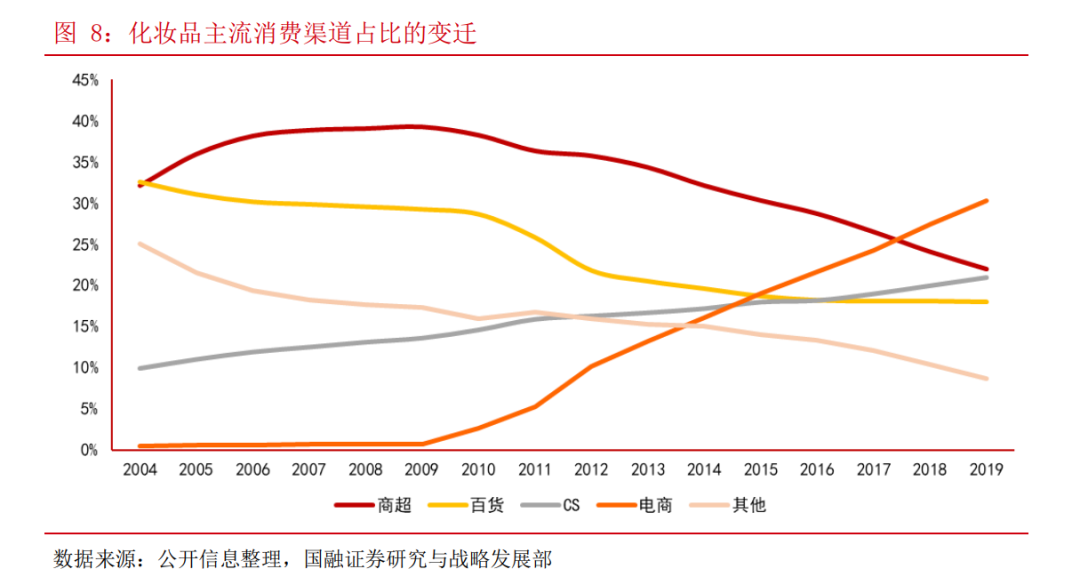 但隨著移動(dòng)互聯(lián)網(wǎng)發(fā)展與消費(fèi)者消費(fèi)習(xí)慣的改變,線上成為兵家必爭(zhēng)之地。數(shù)據(jù)顯示,我國化妝品市場(chǎng)電商渠道占比從2009年低于1%快速提升至2019年的超過30%,成為占比最大的渠道,而過去占比最大的商超和百貨不可避免走向下坡路。