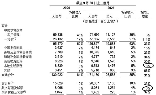 阿里巴巴各項業(yè)務(wù)收入表現(xiàn),圖片來自財報