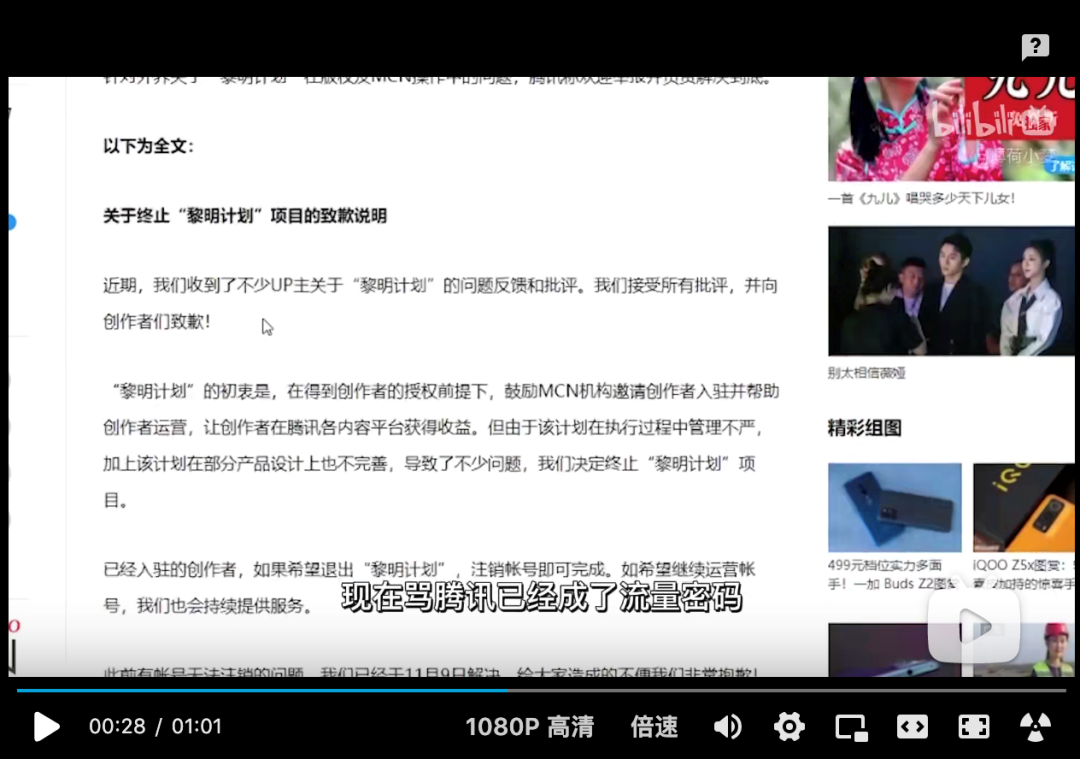 但在執(zhí)行的過程中,黎明計劃引發(fā)了B站UP主的吐槽。11月8日,UP主“薄荷小夢”的視頻《千萬別被騰訊黎明計劃騙了》沖上B站熱榜。之后,騰訊發(fā)布了一封叫停黎明計劃的致歉說明。