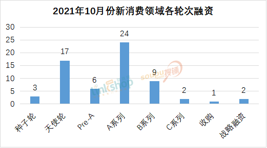 從融資輪次來看,10月份新消費品牌融資集中在A輪、天使輪階段,融資數(shù)量分別都達到24起和17起。值得關(guān)注的是,在A輪以后,不少成熟品牌融資已經(jīng)跑入到B輪階段。