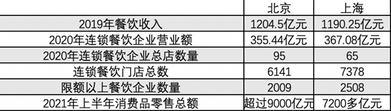 而在限額以上餐飲企業(yè)數(shù)量上,2020年北京為2009家,上海為2508家分列全國第3、5位;在總消費能力上,2021年上半年,上海以超過9000億元的社會消費品零售總額高居全國第一,北京則為7200多億元。
