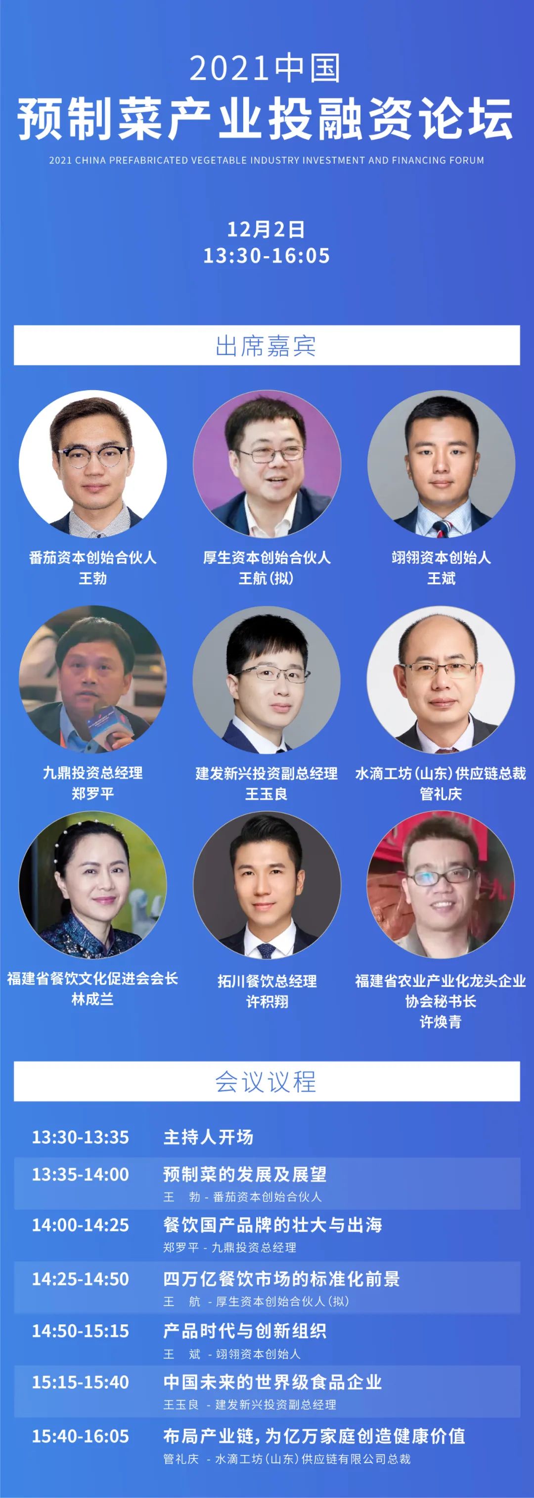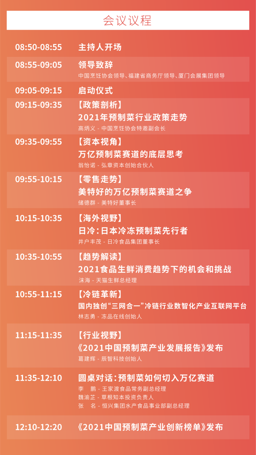 為了助力企業(yè)搶抓預制菜產業(yè)風口,2021中國預制菜產業(yè)大會共開展1場主論壇,7個專題創(chuàng)新論壇和4個同期配套活動,分別為大會主論壇、2021中國預制菜產業(yè)投融資論壇、第十七屆羅非魚產業(yè)發(fā)展論壇、2021中國預制菜產業(yè)供應鏈論壇、第二屆福建省餐飲行業(yè)發(fā)展大會、2021中國預制菜菜品研發(fā)創(chuàng)新論壇、2021中國預制菜產業(yè)新零售渠道交流峰會、2021中國餐飲行業(yè)預制菜交流峰會 、2021中國預制菜產業(yè)大會暨展會歡迎晚宴、《2021中國預制菜產業(yè)發(fā)展報告》發(fā)布、《2021中國預制菜產業(yè)創(chuàng)新榜單》發(fā)布、福建省餐飲品牌名企及預制菜代表企業(yè)訪學旅活動等。