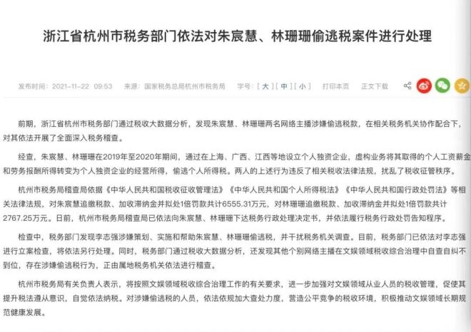 當天,國家稅務總局浙江省杭州市稅務局發(fā)布通報,杭州市稅務部門依法對網(wǎng)絡主播朱宸慧 (微博ID:雪梨Cherie) 、林珊珊 (微博ID:林珊珊_Sunny) 偷逃稅款案件進行處理,兩人被依法追繳稅款、加收滯納金并處罰款分別計6555.31萬元和2767.25萬元。