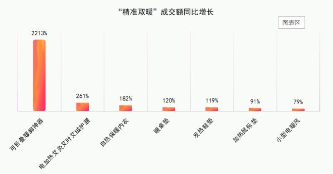 抵御寒潮的動(dòng)作也能很“精準(zhǔn)”。很多有保暖功能的小物件在寒潮影響下熱銷?烧郫B暖腳神器受到職場(chǎng)用戶歡迎,成交額同比增長(zhǎng)超過20倍。電加熱艾灸護(hù)腰、自熱保暖內(nèi)衣、暖桌墊等成交額同比增長(zhǎng)超過100%。同時(shí),人們也沒有忘記給自己的寵物取暖,狗狗貓咪電熱毯成交額同比增長(zhǎng)56%。