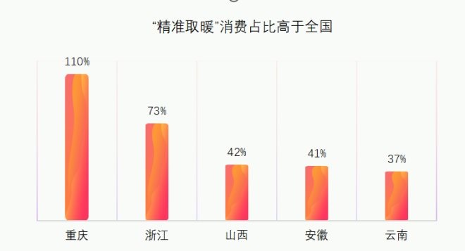 從區(qū)域市場(chǎng)特色來看,重慶、浙江、山西、安徽、云南等地“精準(zhǔn)取暖”消費(fèi)占比高于全國(guó)其他地區(qū)。他們更喜歡使用小型電暖風(fēng)、暖桌墊、艾灸護(hù)腰等小物件來增加初冬生活中的“暖意”。