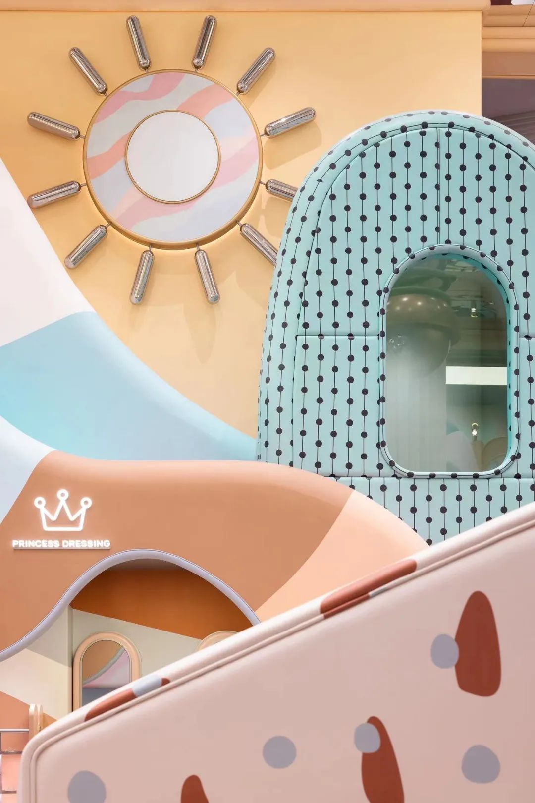 中國傳統(tǒng)的樂園在配色上總是繞不開“紅黃藍(lán)”,強(qiáng)烈的色彩沖擊被認(rèn)為是高效吸客手段,奈爾寶則一改傳統(tǒng)做法,利用馬卡龍配色為孩子們“造夢”的同時(shí),也滿足家長的拍照、社交需求。