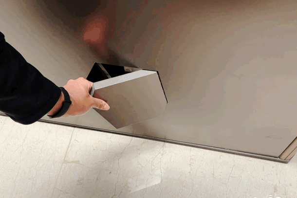 我們和項(xiàng)目設(shè)計(jì)團(tuán)隊(duì)做了交流,得知為了保證這一效果的實(shí)現(xiàn),一方面在扶梯加上特質(zhì)鋼架結(jié)構(gòu),另一方面將側(cè)板石材的切薄,以在美觀的前提下保證結(jié)構(gòu)的穩(wěn)定。