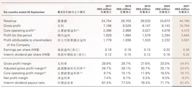 根據(jù)公告,在截至9月30日的六個月內(nèi),集團的營業(yè)額同比上升79.1%至441.86億港元,毛利潤大漲32.6%至107.94億港元,凈利潤也錄得60.4%的增幅至35.81億港元。