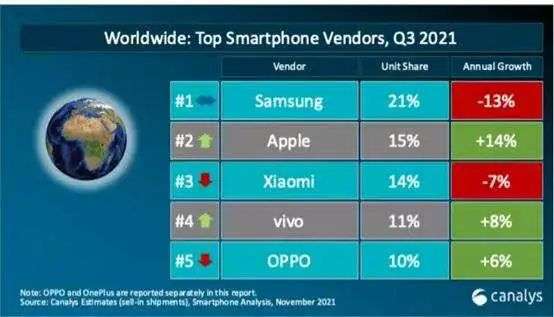Canalys發(fā)布2021年Q3全球手機(jī)市場份額數(shù)據(jù)