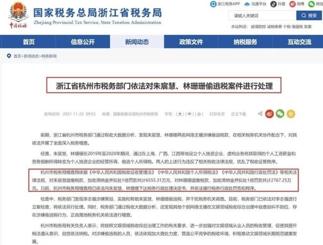 杭州市稅務(wù)局官網(wǎng)公告,近日杭州市稅務(wù)部門發(fā)現(xiàn),朱宸慧(雪梨)、林珊珊兩名網(wǎng)絡(luò)主播涉嫌偷逃稅款,二者將被依法追繳稅款、加收滯納金并處罰款分別計(jì)6555.31萬(wàn)元和2767.25萬(wàn)元。