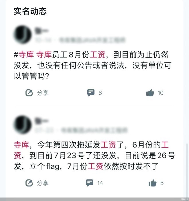 投訴者不只是消費者,還有寺庫員工表示被公司拖欠工資。北京商報記者在脈脈App中看到,有多個認證為寺庫員工的用戶投訴工資被拖欠。其中,認證為“寺庫集團JAVA開發(fā)工程師”的員工表示:“8月的工資到目前為止仍然沒發(fā),也沒有任何公告或者說法。這已經(jīng)是寺庫今年第四次拖延發(fā)工資了!
