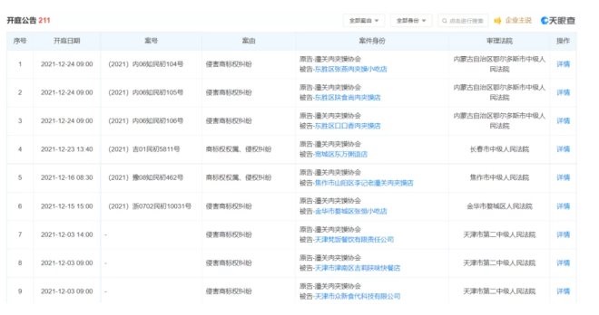 天眼查信息顯示,潼關(guān)肉夾饃協(xié)會(huì)以“侵害商標(biāo)權(quán)糾紛”“商標(biāo)權(quán)權(quán)屬、侵權(quán)糾紛”等理由起訴了數(shù)百家小吃店、快餐店,短短幾個(gè)月內(nèi),共計(jì)開庭公告信息達(dá)到211條。