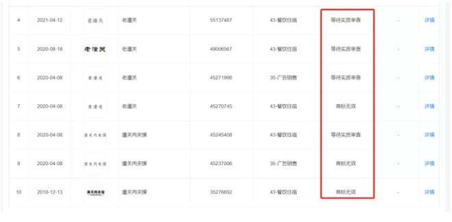該協(xié)會(huì)目前僅成功注冊(cè)方便食品類“潼關(guān)肉夾饃”一枚商標(biāo),于2015年12月完成注冊(cè),專用權(quán)期限至2025年12月。此外,該協(xié)會(huì)近年來一直在申請(qǐng)注冊(cè)“老潼關(guān)”“潼關(guān)肉夾饃”等商標(biāo),國際分類為餐飲住宿、廣告銷售,但目前相關(guān)商標(biāo)狀態(tài),多為無效及待審狀態(tài)。