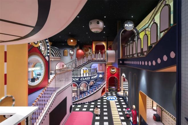 禮物盒主題區(qū)與公寓主題區(qū)摒棄了經(jīng)驗(yàn)設(shè)計(jì)的手法,放大版的禮物盒堆疊出了小城,被風(fēng)暴吹得“東倒西歪”的房子打破次元,體現(xiàn)漫畫(huà)世界的童趣;棋盤(pán)主題區(qū)的設(shè)計(jì)運(yùn)用了愛(ài)麗絲童話的敘事元素與構(gòu)圖,用濃烈飽和的童話底色為空間渲染上了一層夢(mèng)幻基調(diào);試管主題區(qū)設(shè)計(jì)師以寓教于樂(lè)的方式,引領(lǐng)并啟發(fā)著小朋友對(duì)事物產(chǎn)生好奇心和探索欲。