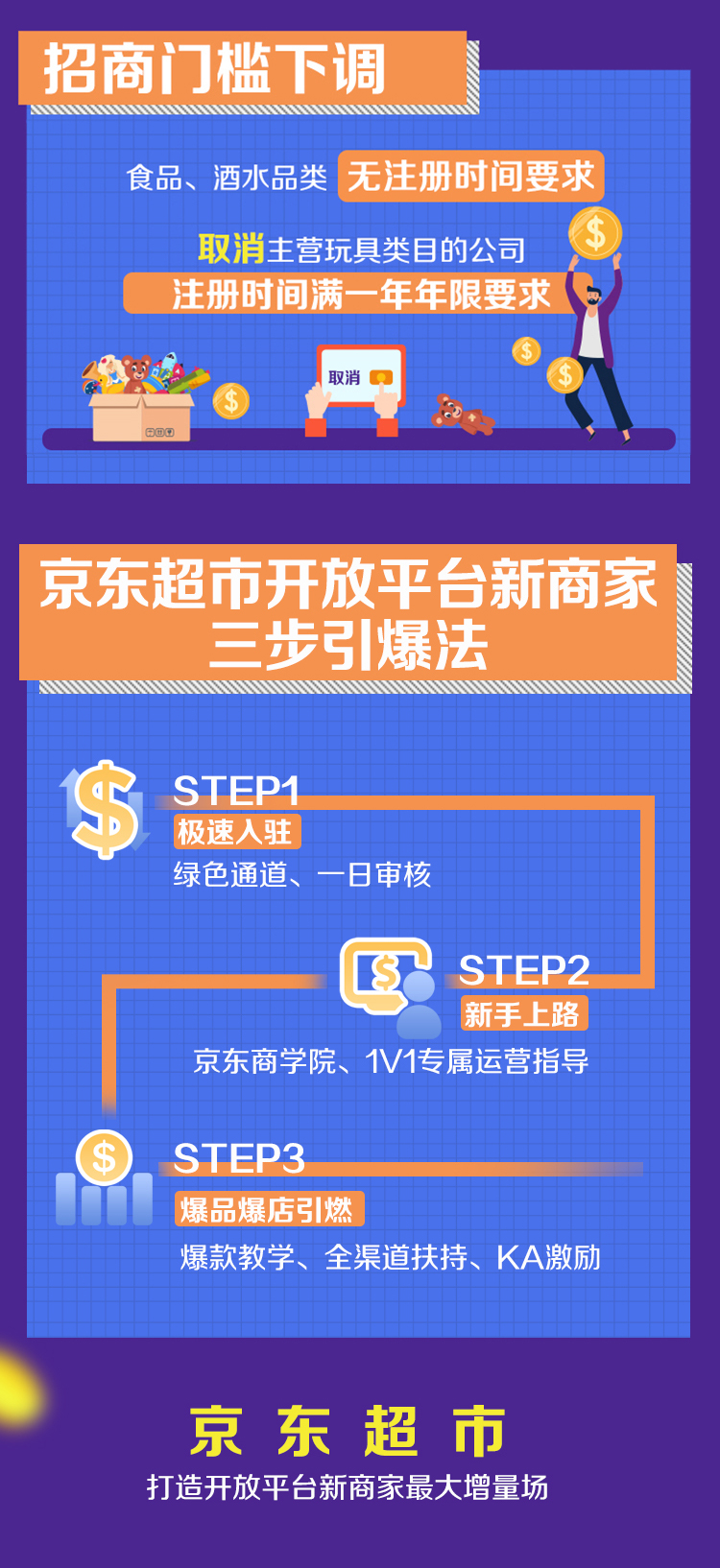 首先在下調(diào)入駐門檻方面。在食品、酒水商家沒有注冊時(shí)間年限要求基礎(chǔ)上,京東超市進(jìn)一步降低商家準(zhǔn)入門檻,取消主營玩具類目的公司注冊時(shí)間滿一年年限要求,全面開放各品類招商。