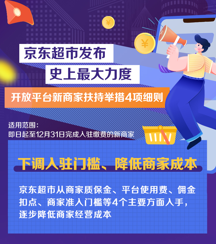 從即日起至12月31日,在京東超市完成入駐繳費(fèi)的各品類開放平臺(tái)商家,均能夠享受新商家扶持政策。