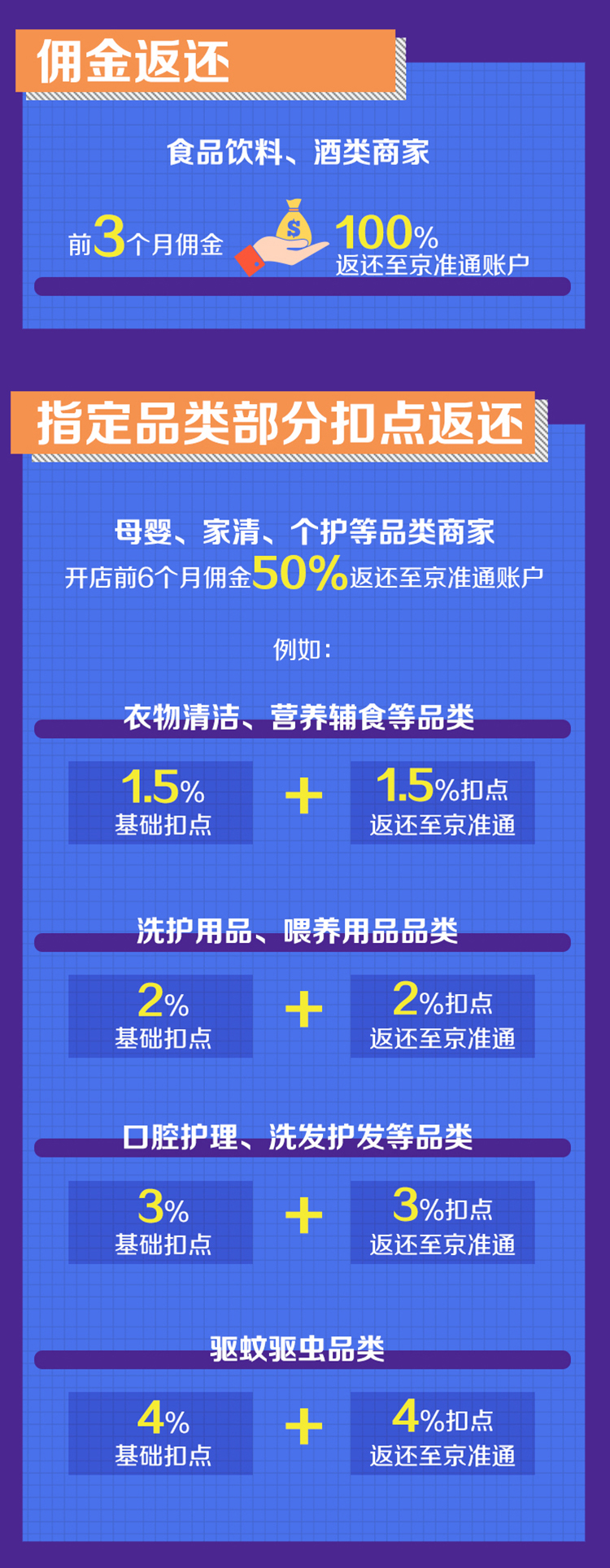 而對于母嬰、家清、個(gè)護(hù)等品類商家,開店前6個(gè)月傭金可享50%返還至京準(zhǔn)通賬戶。其中,衣物清潔、營養(yǎng)輔食等品類采取1.5%基礎(chǔ)扣點(diǎn)、1.5%返還至京準(zhǔn)通,洗護(hù)用品、喂養(yǎng)用品品類采取2%基礎(chǔ)扣點(diǎn)、2%返還至京準(zhǔn)通,口腔護(hù)理、洗發(fā)護(hù)法等品類采取3%基礎(chǔ)扣點(diǎn)、3%返還至京準(zhǔn)通,驅(qū)蚊驅(qū)蟲品類采取4%基礎(chǔ)扣點(diǎn)、4%返還至京準(zhǔn)通。