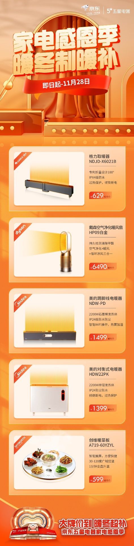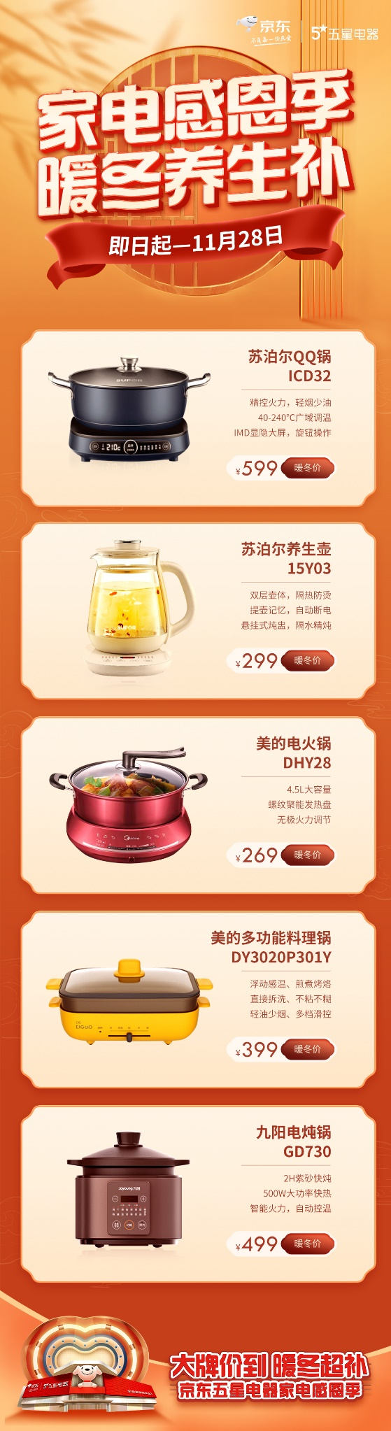 據(jù)京東五星電器表示,即日起至11月28日,京東五星電器、京東電器全面開啟“家電感恩季”活動,涵蓋了取暖器、暖風(fēng)扇、踢腳線、暖菜板、電燉鍋、養(yǎng)生壺、電火鍋、料理鍋等冬季購買頻率較高的爆款小家電,價格刷新促銷新坐標(biāo),讓消費者簡單直接“抄作業(yè)”!