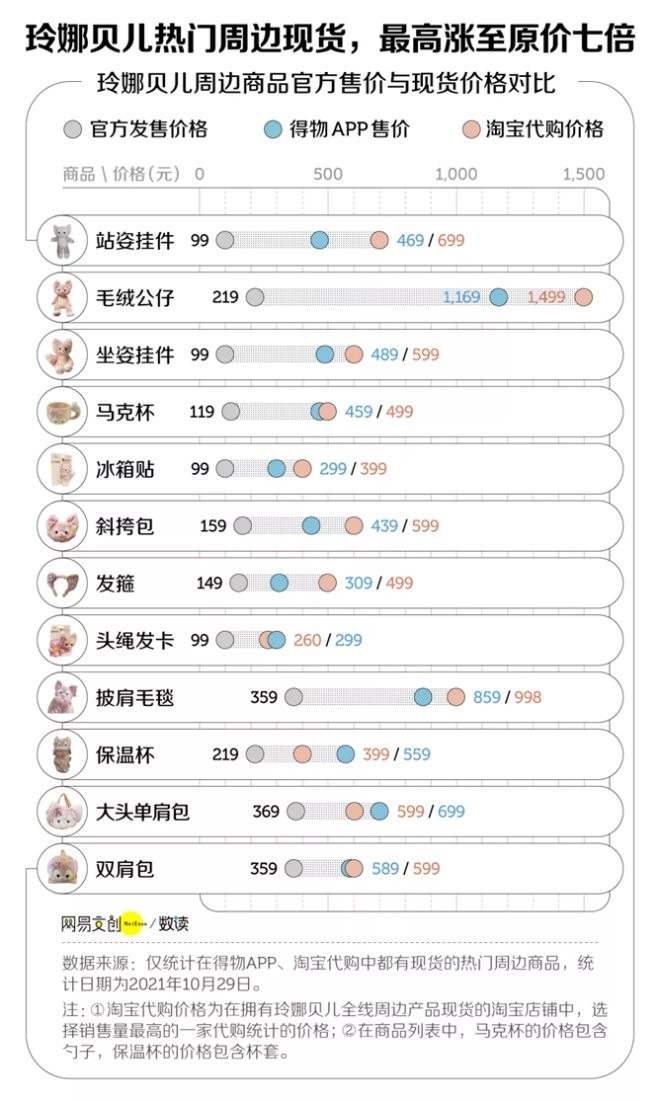 隨著玲娜貝兒火爆,上海迪士尼官方推出了將近三十款的玲娜貝兒周邊,第一天開售就被一掃而空。據(jù)微信公眾號“網(wǎng)易數(shù)讀”梳理,玲娜貝兒周邊正式發(fā)售一個月后,在得物和淘寶代購店鋪內(nèi)同時擁有現(xiàn)貨的產(chǎn)品只有12件,官方售價從99元到369元不等,但現(xiàn)貨價格最高已上千元。其中,最為搶手的是高約40cm的毛絨公仔,官方定價219元,在得物售價1169元,淘寶代購更是賣到了1499元的高價,接近原價七倍。