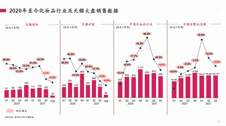 宏觀大環(huán)境更不容忽視:彩妝市場下半年增速都在放緩,一個不爭的事實是,新消費行業(yè)遇冷。國家統(tǒng)計局數據顯示,今年9月,我國化妝品零售總額增速為3.9%;7月,同比增速2.8%;8月增速為零。這樣的數據顯示,今年三季度成為國內化妝品行業(yè)近十年遭遇的“最冷消費季”。