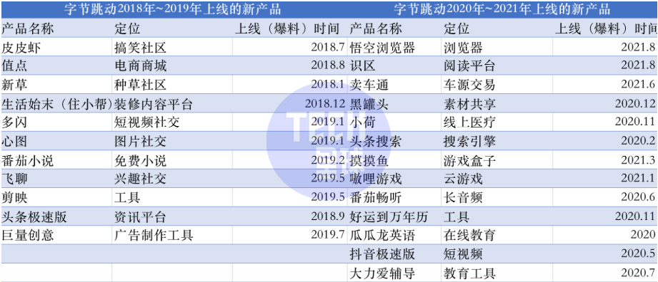 字節(jié)產品從2018年開始到2020年都處于一個高速的產出階段,以獨立App數(shù)為例,這期間共有19款產品上線,這不包括其他獨立產品下的子產品。但進入到2021年后,字節(jié)的產品線收縮,如果包含還未上線的“識區(qū)”,僅有5款產品,相比于2019年和2020年都有所減少,呈現(xiàn)下降趨勢。