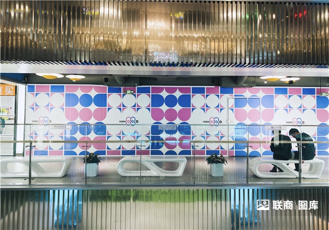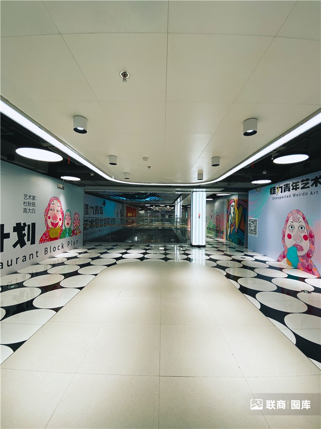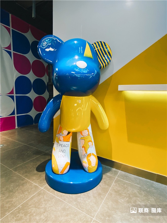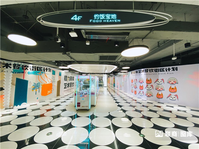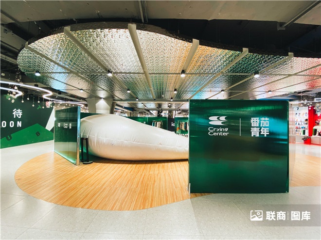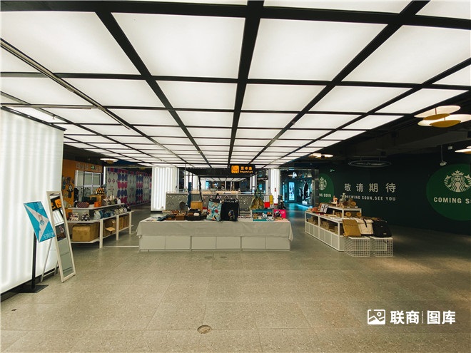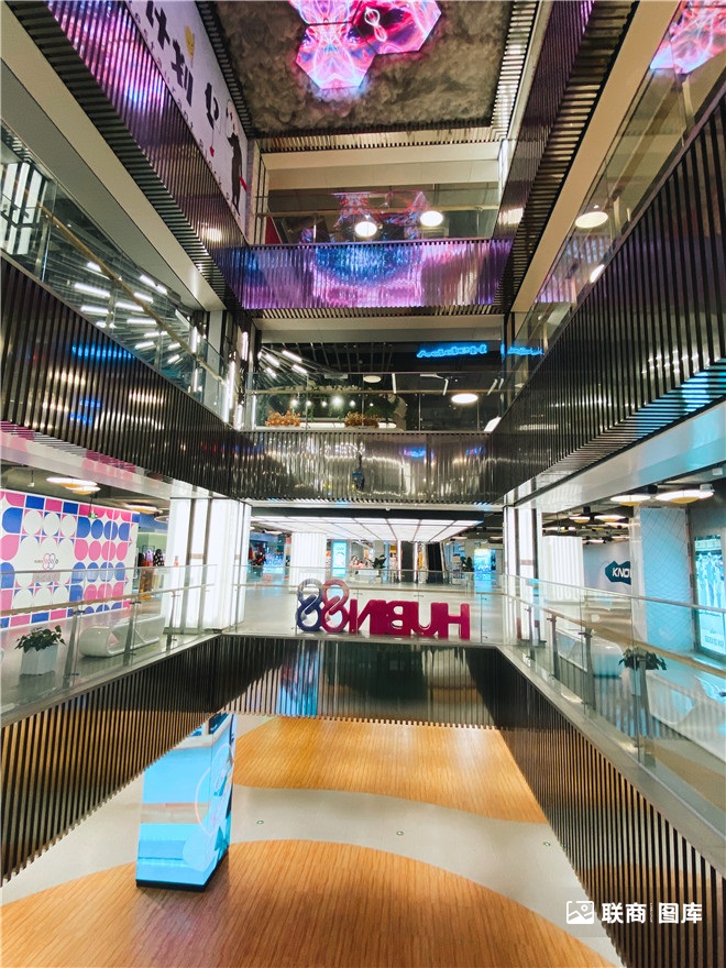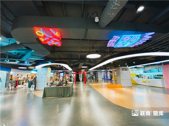 同時,商場內(nèi)也做了一些場景設(shè)計。整體裝修工業(yè)風(fēng),吊頂做了一些年輕化的設(shè)計,中空增加了自流體設(shè)計,更顯潮流,一樓中庭策展了一些商業(yè)活動(目前是封閉裝狀態(tài)),甚至也裝置了一些IP形象。